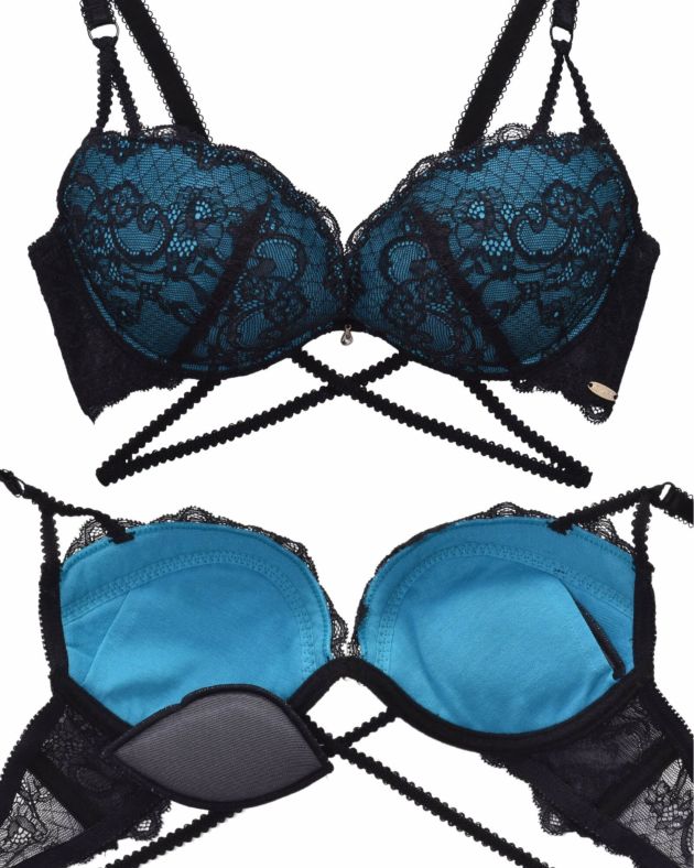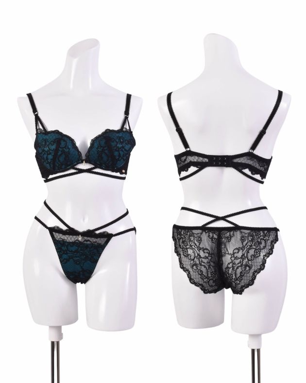 上品なブラックレースから覗く華やかなパット、中央の煌びやかなチャームが映えるランジェリー。